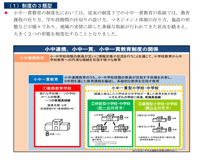 - 小中一貫型小学校・中学校=独立した小学校及び中学校が一貫した教育を施す形態なので、それぞれの学校に校長がいて教職員組織がある。